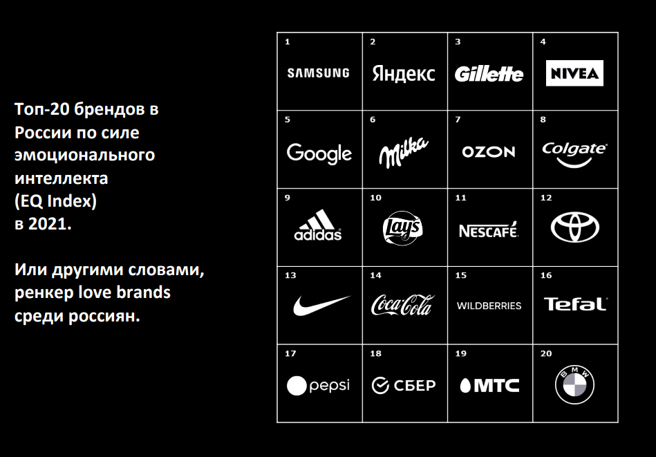 В агентстве отметили, что EQ подтвержден в том числе влиянию внешних политических факторов. Люди остро чувствуют, что бренды изменяют к ним отношение — бросают их, меняют правила игры. Кризис сказался на взаимоотношениях брендов и потребителей, поэтому топ-20 брендов в России по силе эмоционального интеллекта (ренкер love brands среди россиян) по итогам 2022 года может значительно измениться. В 2021 его занимали в основном международные компании.