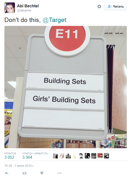Сеть магазинов розничной торговли строительных материалов Target отказалась от разделения игрушек по гендерному принципу после того после того, как недовольный посетитель выложил в сеть фото с табличкой «Строительные игрушки для девочек».