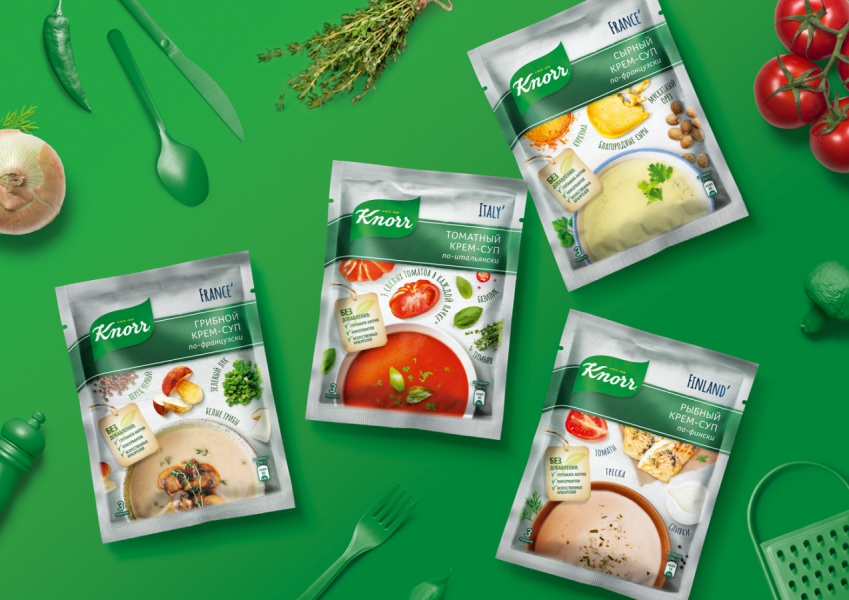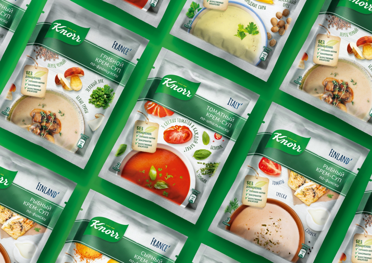 В апреле бренд Knorr вывел на российский рынок абсолютно новую и непривычную для себя продуктовую линейку крем-супов. Разработку дизайна упаковки доверили креативной команде