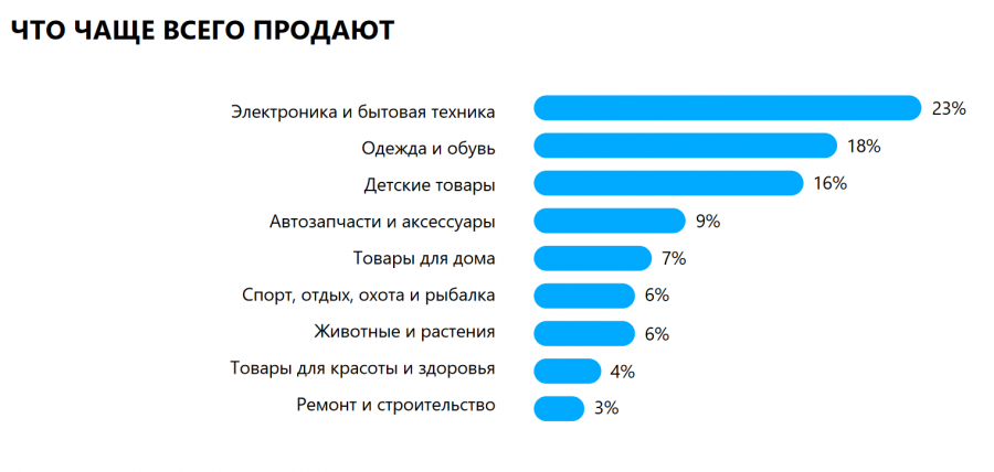 Средний чек c2c-сделок составил 3210 рублей. Почти четверть интернет-пользователей (23%) продают электронику и бытовую технику. Также популярны категории «одежда и обувь», «детские товары» и «автозапчасти».