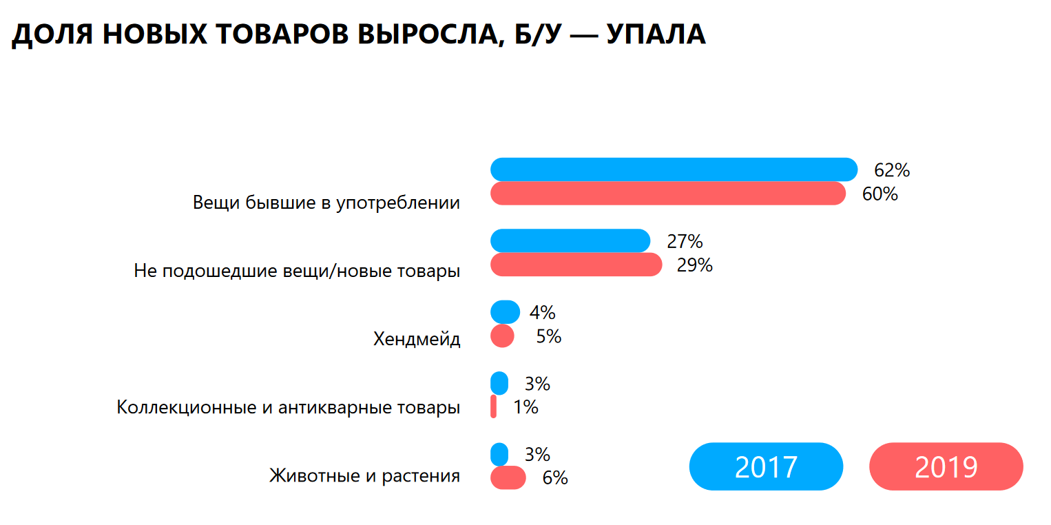 Аналитики также выяснили, что пользователи в основном продают вещи, уже бывшие в употреблении, но доля таких продаж постепенно снижается. Новые вещи, наоборот, становятся популярнее в с2с-сегменте. Выросли продажи handmade-товаров, но снизились сделки с коллекционными товарами и антиквариатом. Вдвое популярнее стала торговля животными и растениями.
