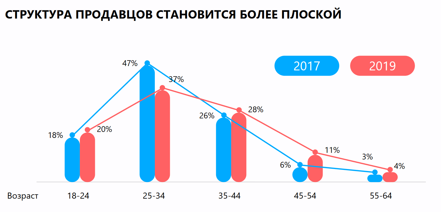 Частной онлайн-торговлей занимается в основном молодая аудитория в возрасте от 25 до 34 лет — на них приходится 37% продаж, при этом за два года этот показатель снизился, но увеличилась доля более возрастной аудитории старше 35 лет. «Средний» частный продавец сегодня — это семейный мужчина в возрасте от 30 лет со средним уровнем дохода.