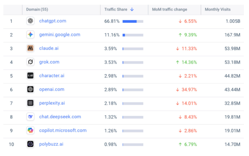 Рынок чат-ботов уже не является монополией в чистом виде, но остается асимметричным. ChatGPT по-прежнему контролирует около двух третей трафика, однако рост Gemini и появление новых игроков указывают на постепенное перераспределение внимания пользователей.