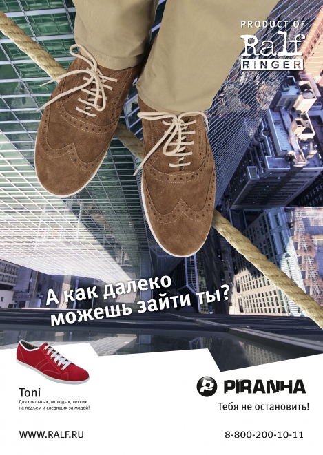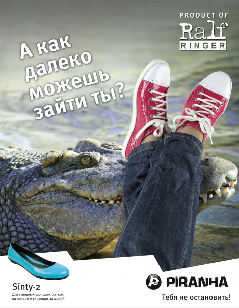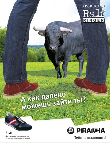 Агентство Cheil Russia представило новую рекламную кампанию бренда молодежной обуви Piranha, принадлежащего компании Ralf Ringer. Коммуникация включает в себя три принта, на каждом из которых красуется вызывающий слоган: «А как далеко можешь зайти ты?».