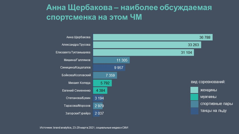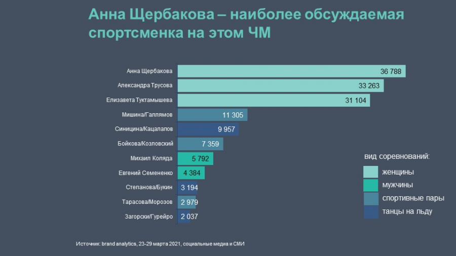 Наибольший интерес среди интернет-пользователей вызвало женское одиночное катание — топ-3 по количеству упоминаний в соцмедиа и СМИ среди всех спортсменов сборной России. Причем 37 тыс. упоминаний в Рунете было посвящено чемпионке мира в женском одиночном катании и золотой медалистке чемпионата Анне Щербаковой, что позволило ей занять первое место в рейтинге признания болельщиков.