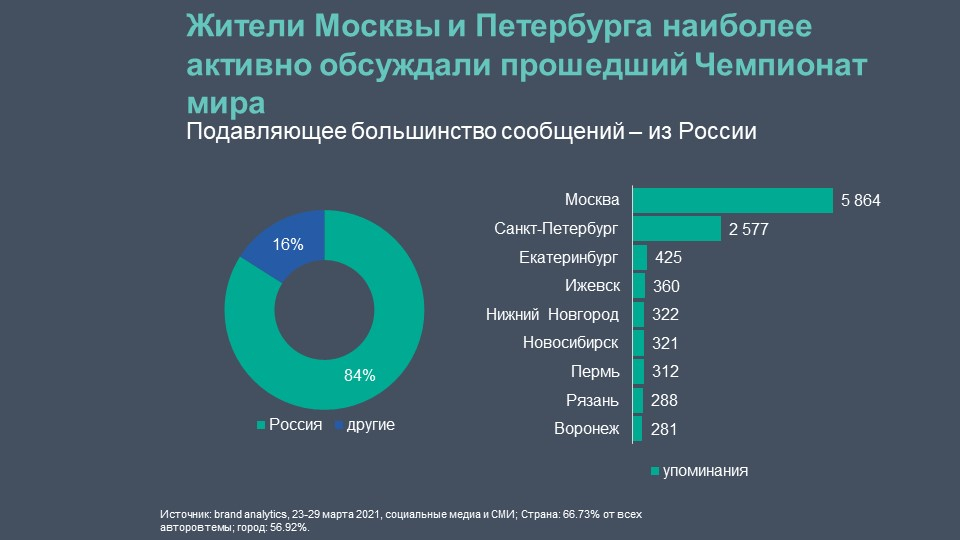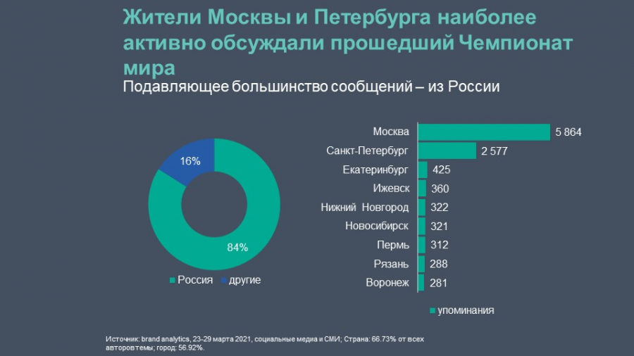 При этом наиболее активно победы российских фигуристов обсуждали жители Москвы и Санкт-Петербурга — на них пришлось около 5,9 тыс. и 2,6 тыс. упоминаний соответственно. На зарубежных пользователей пришлось лишь 16% от общего числа сообщений.