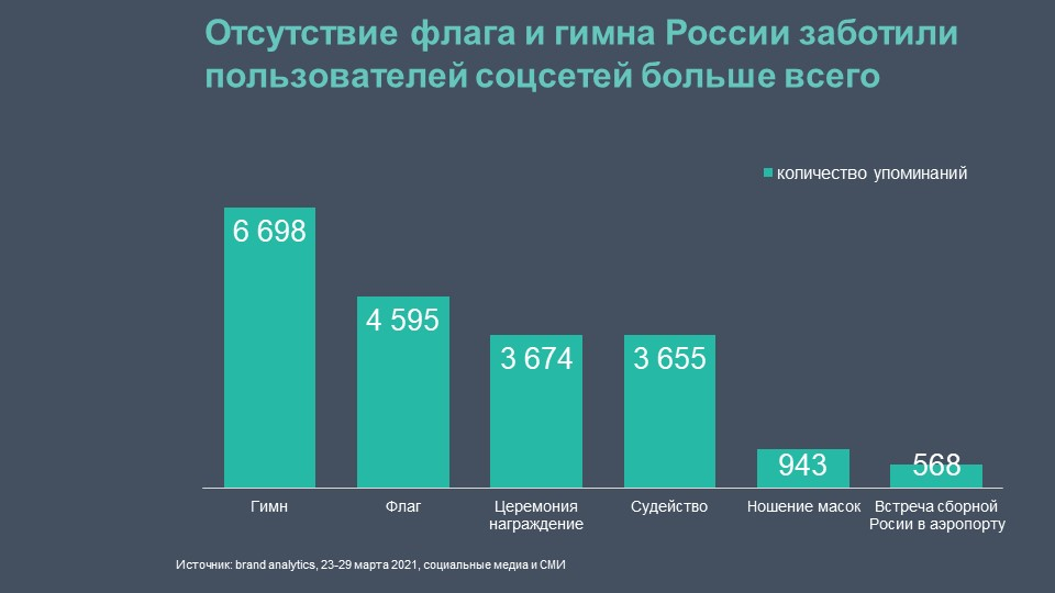 Однако больше всего пользователей заботили отсутсвие российского флага и гимна. Из-за санкций WADA (World Anti-Doping Agency, Всемирное антидопинговое агентство) вместо гимна во время награждения спортсменов звучал Первый концерт Чайковского, а вместо триколора поднимали эмблему Федерации фигурного катания на коньках России (ФФКР). Судейство в фигурном катании также подверглось критике со стороны болельщиков: фанаты возмущались низкими оценками танцевальной пары Александры Степановой и Ивана Букина.