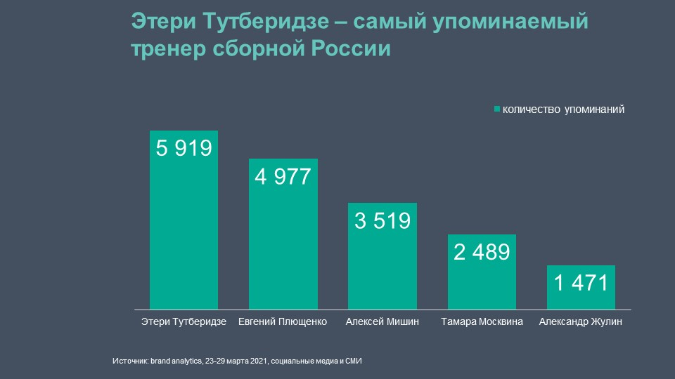 Яркое противостояние болельщики по популярности в соцсетях наблюдали не только среди спортсменов, но и среди тренеров. Однако статус самого обсуждаемого тренера страны в итоге получила Этери Тутберидзе вместе с золотом в женском одиночном катании — почти 6 тыс. упоминаний в соцмедиа. Евгения Плющенко упоминали чуть реже — 5 тыс.