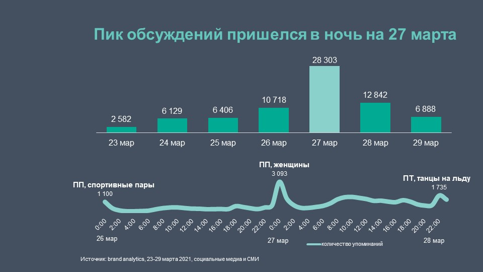 Пик упоминаний чемпионата был зафиксирован сразу после окончания произвольной программы у женщин — 27 марта. В этот день пользователи опубликовали наибольшее количество сообщений — более 28 тыс. Болельщики поздравляли Щербакову и пару Синициной и Кацалапова с победой.