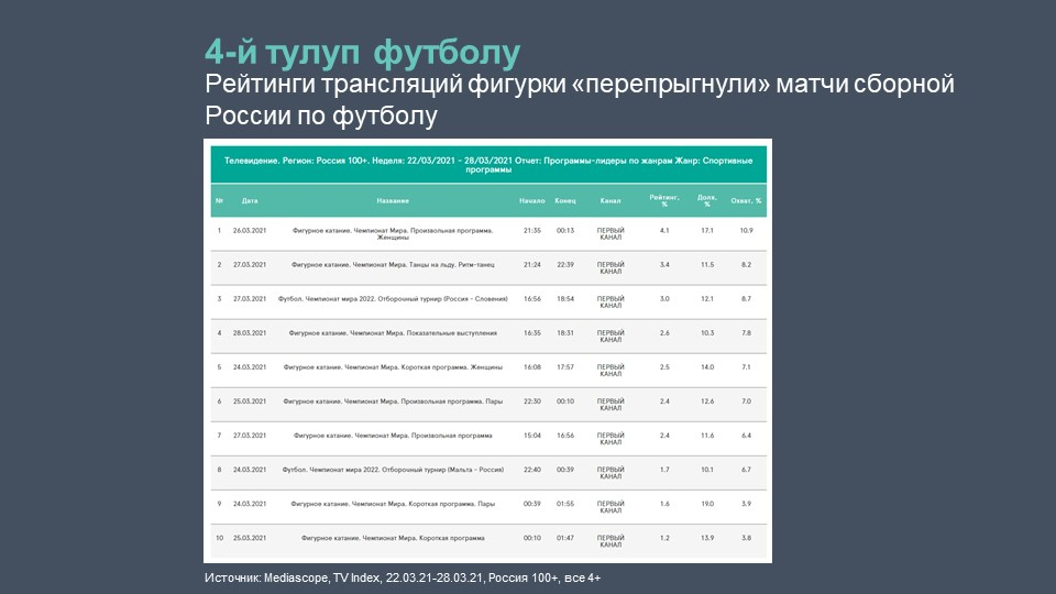 Кроме того, фигурное катание по рейтингу ТВ-трансляции обогнало футбол. Телепросмотры Чемпионата мира в Стокгольме в этом году обогнали матчи сборной России по футболу.