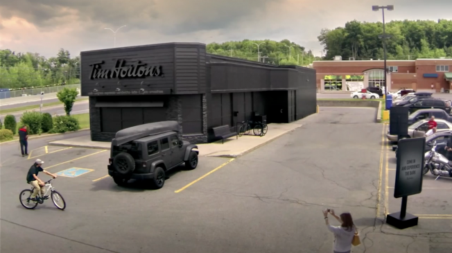 Для рекламы нового способа обжарки черного кофе, сеть кофеен Tim Hortons и канадское подразделение JWT провели необычную и немного пугающую рекламную акцию в Квебеке. Креаторы создали черное кафе, которое было похоже на безумную фантазию: черные как смоль стены и все объекты вокруг - машины, знаки, велосипеды. Тех прохожих, кто отваживался заглянуть внутрь, ждало помещение, погруженное в абсолютную темень. Персонал кафе в приборах ночного видения предлагал подопытным попробовать кофе по новому рецепту, после чего тьма отступала.