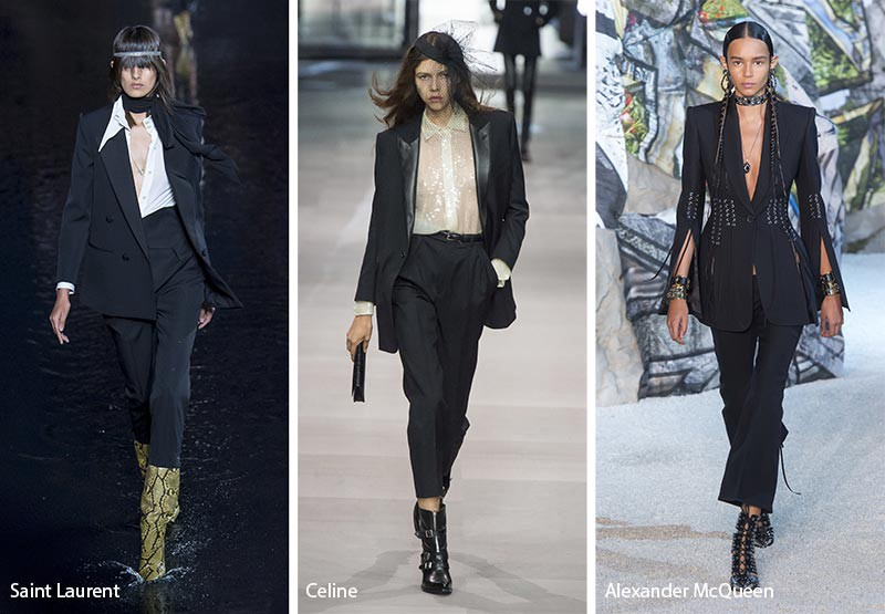 В это время в моду вернулись черные костюмы и пиджаки. В сочетании с брутальными прическами и макияжем моделей на модных показах они создают ощущение воинственности и силы, в чем эксперты видят откровенный политический контекст.
