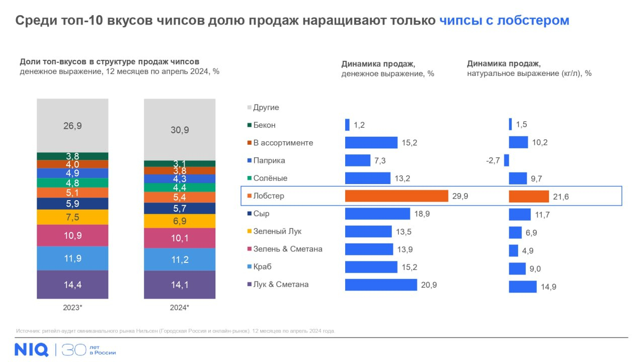 Среди самых популярных вкусов единственным растущим сегментом по доле продаж стали чипсы со вкусом лобстера. Традиционные вкусы потеряли долю в пользу более необычных сочетаний (например, «сливочный соус и лосось», «лисички в сметане», «сметана и специи»). Причины — усилия отдельных игроков, инвестирующих в продвижение менее популярных сочетаний вкусов, и желание потребителей попробовать что-то необычное.