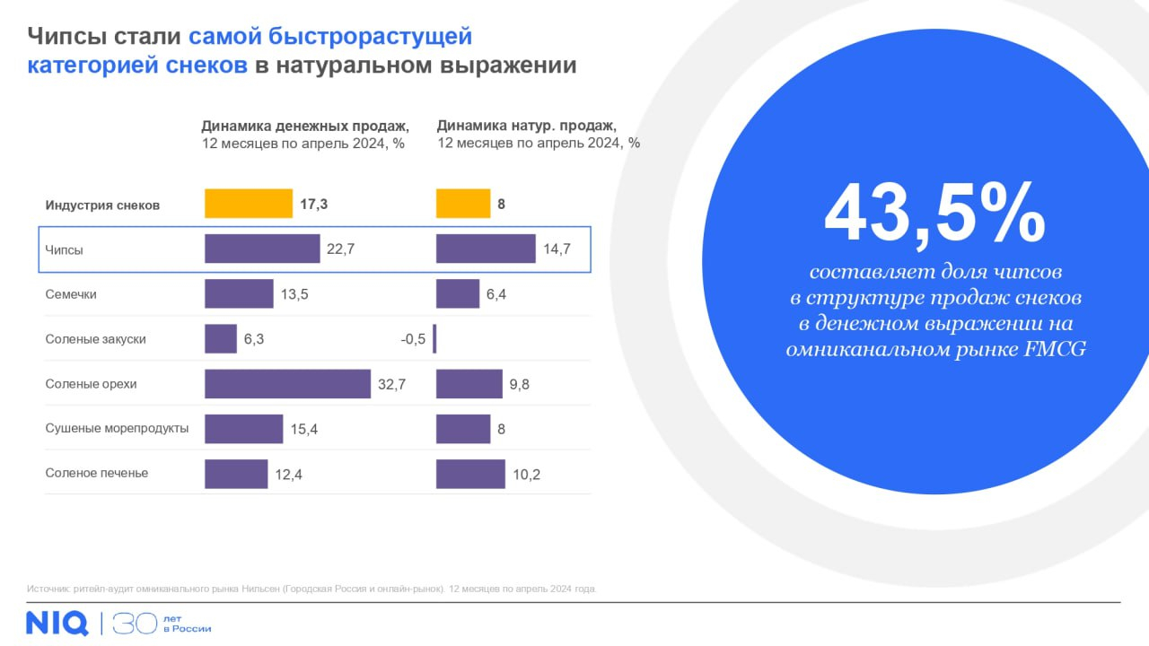 С апреля 2023 года до апреля 2024 года индустрия снеков (чипсы, семечки, орехи, солёные закуски, сушёные морепродукты, солёное печенье) стала самой быстрорастущей на омниканальном рынке товаров повседневнего спроса. Доля чипсов в структуре продаж снеков в денежном выражении достигла 43,5%. Таковы данные исследования NielsenIQ, которое есть в распоряжении Sostav.