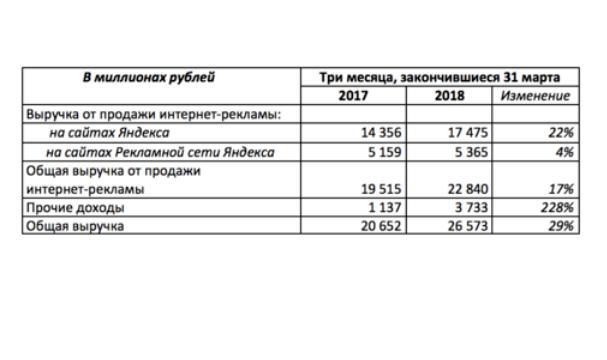 Выручка от продажи рекламы на сайтах «Яндекса» увеличилась на 22% по сравнению с аналогичным показателем за первый квартал 2017 года и составила 66% от общей выручки компании в первом квартале 2018 года.
