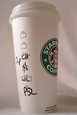 Барриста уточняет заказ: «со взбитыми сливками или без?». Клиент выбирает взбитые сливки. Барриста передает заказ уже на «особом» языке: «Капуччино Гранде со взбитыми сливками». Затем, вид кофе и его «правильное» наименование указывается на стакане.