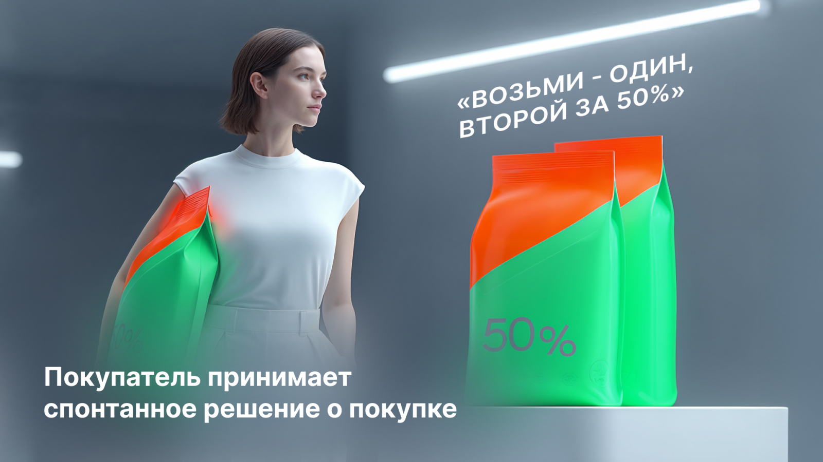 - Вариант 1. Видит рекламу стирального порошка на баннере у входа или акционное предложение «Возьми один, второй за 50%» и принимает спонтанное решение о покупке. Вероятнее всего, это новый покупатель, которого удалось привлечь рекламой.