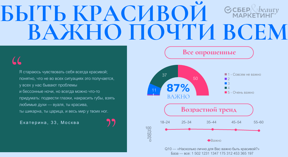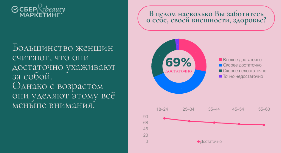 Красота сильно связана с эмоциональным состоянием женщины. Если в хорошем настроении девушка открыта для экспериментов и может попробовать, скажем, синюю тушь. То, наоборот, в подавленном настроении макияж — это возможность привести себя в чувства и поднять восприятие себя до базового уровня. Этому также сильно помогает, если у женщины есть сформированная привычка ухаживать за собой и ежедневная beauty рутина. Кстати, 69% женщин считают, что они достаточно ухаживают за собой. Правда, с годами этот процент становится ниже. Поэтому брендам, желающим помочь российским женщинам, в первую очередь нужно подарить время с собой и вдохновить на уход за собой.