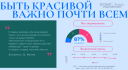 Значимость красоты подтвердили большинство россиянок (87%), при этом 86% женщин, участвующих в опросе, считают себя красивыми. Для большинства (73%) — главный критерий, что они нравятся себе сами, только для 11% важна оценка окружающих (комплименты) и для 17% значимо и то и другое.