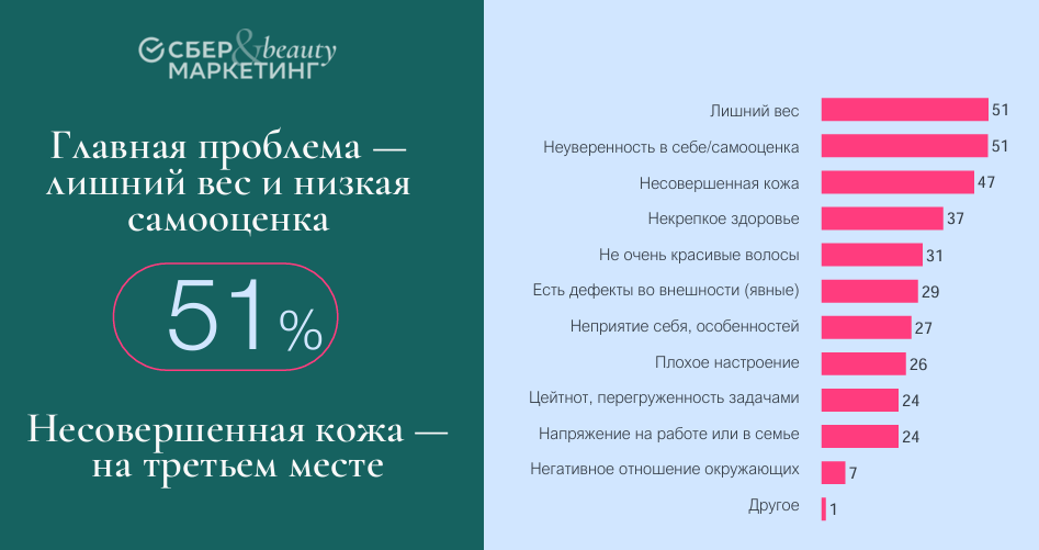 Ощущению собственной красоты мешают как внешние, так и внутренние причины. Среди внешних факторов женщины чаще всего называют несбалансированный вес (51%), проблемы с кожей (47%), а также неумение наносить макияж (32%). Внутренние барьеры — это заниженная самооценка (51%), отсутствие привычки ухаживать за собой (40%) и эмоциональное истощение, связанное с кризисными периодами в жизни (24%).