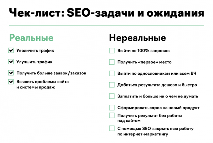 Резюмируем: при заказе SEO вас интересует только трафик и его конверсия в заявки/просмотры/другие полезные для вас действия на сайте. Если вы идете к SEO-специалистам с другими задачами, вы теряете время зря.