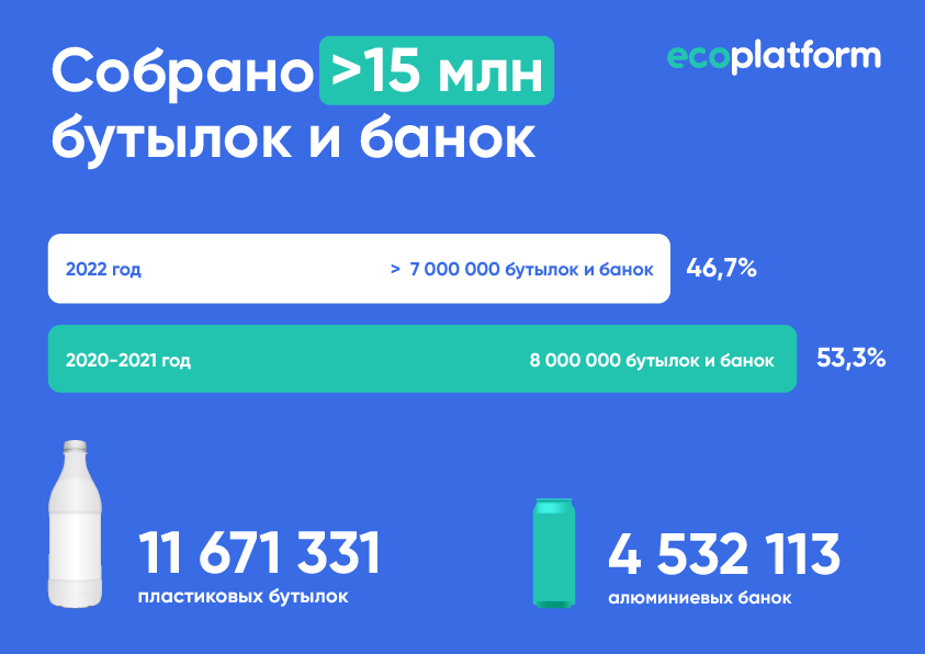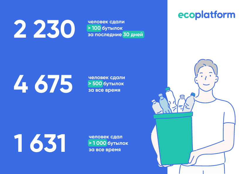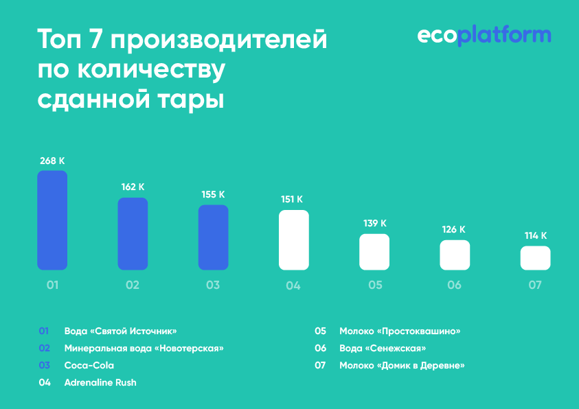 По подсчётам производителя автоматов для приёма тары Ecoplatform, россияне сдали на переработку более 15 млн пластиковых бутылок и алюминиевых банок за два года. Чаще всего экологичные граждане сдают тару от «Святого Источника» объемом 1,5 л, на втором месте — «Новотерская», объёмом 1,5 л, чуть реже жители страны сдавали бутылки Coca-Cola объёмом 1,5 л. Результаты исследования имеются в распоряжении Sostav.