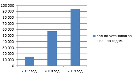 Ниже представлены показатели количества установок в течение каждого июля периода с 2017 по 2019 годы.