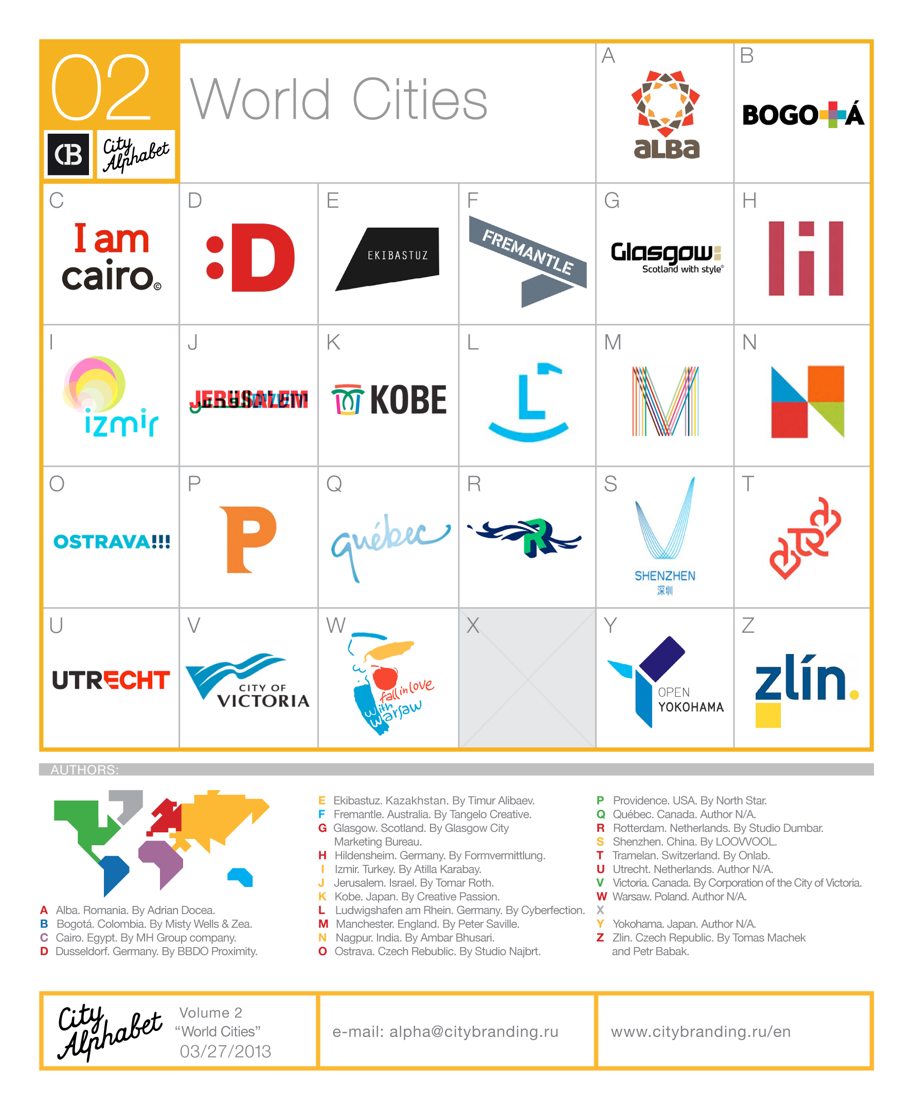 Команда CityBranding выпустила второй выпуск Азбуки Городов, куда на сей раз вошли логотипы зарубежных городов. В алфавите представлены 19 стран с 6 континентов. В отличие от Азбуки Городов СНГ в логотипах зарубежных городов шрифтовые решения превалируют над иллюстративными, что может в скором времени стать трендом и для российских городов, считают в CityBranding.