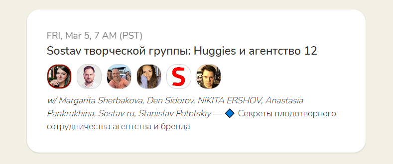 На следующей неделе мы возобновим марафон встреч в Clubhouse, чтобы продолжить рассказывать о трендах в рекламных кампаниях и поднимать наболевшие вопросы рынка. До встречи в эфире комнаты проекта «Sostav творческой группы»!