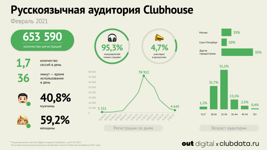Затем число новых участников начало снижаться и 27 февраля составило 4,6 тыс. человек. Всего в соцсети зарегистрировались 653,6 тыс. человек. В среднем они проводят в Clubhouse 36 минут, активно участвуют в дискуссиях 4,7% пользователей, остальные только слушают.
