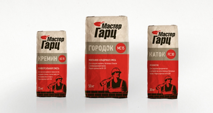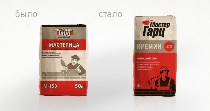 Необходимо было укрепить позиции марки «Мастер Гарц», как марки наиболее качественных традиционных сухих строительных смесей. Продукцию «Мастер Гарц» активно используют при строительстве и реконструкции объектов и зданий федерального значения. Поэтому было важно сохранить узнаваемость, чего креаторы добились, сохраняя цветовые пятна и присутствие персонажа.