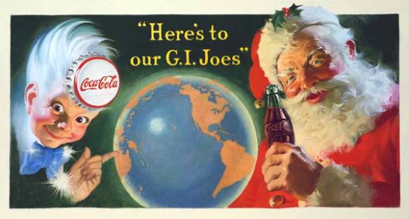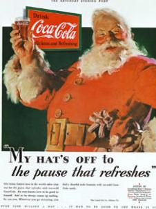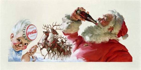 Санта-Клаус был впервые использован в рекламе Coca-Cola в 1920-е годы. В 1931 году Арчи Лесс, исполнительный директор рекламного агентства D'Arcy, работавшего с компанией, задумался об изображении персонажа. Решено было создать более здоровый образ Санты, который стал бы одновременно реалистичным и символичным. Тогда американский художник Хэддон Сандблом представил своё видение Санты, основанное на его изображении в поэме Клемента Кларка Мура 1822 года «Визит Святого Николая». Получившаяся реклама дебютировала в журнале The Saturday Evening Post. Финальную версию Санта Клауса Сандблом разработал в 1964 году, но на протяжении нескольких десятилетий компания использовала его образ, основанный на первоначальном изображении персонажа художником. Эти рисунки – одни из наиболее ценных в арт-коллекции компании. Они побывали на выставках по всему миру, в том числе в парижском Лувре, в Королевском музее Онтарио в Торонто, в Музее науки и промышленности в Чикаго и в других. Многие оригинальные произведения можно увидеть на выставке Мир Кока-Колы в Атланте, штат Джорджия.