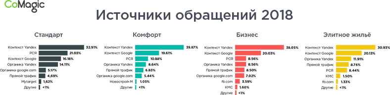 Ставка была сделана на контекстную рекламу как на один из самых конверсионных каналов в отрасли. Это подтверждают исследования СоMagic за 2018 год. Доля трафика из контекстной рекламы по типам источников обращений составляла от 58% до 68%. На остальные типы источников приходилось в среднем 40%. Органический трафик составлял от 13% до 20%, прямые заходы — от 4% до 8%, внутренние переходы — от 1% до 3%. Обращения из социальных сетей и e-mail-рассылок, партнерских программ составили менее 3% по всем исследуемым классам жилья.