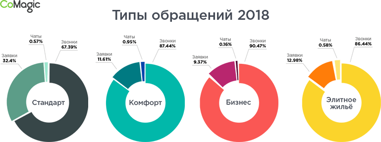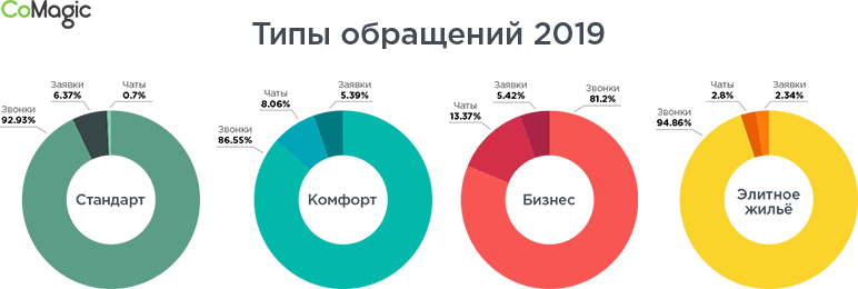 Большинство клиентов в недвижимости выбирают телефонный звонок как самый быстрый и доступный способ связи. В 2019 году их количество варьировалось от 81,2% в классе «Бизнес» до 94,86% в классе «Элитное жилье». Средний показатель обращений с помощью звонка по всем классам жилья составил около 89%, с помощью чатов — чуть более 6%, с помощью заявок — около 5%.