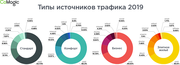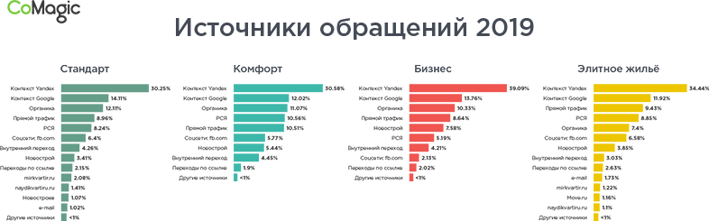 В 2019 году доля обращений с контекста варьировалась от 62% до 68%, с органического трафика пришли от 9% до 12%, с прямых переходов — от 7% до 11%, с внутренних — от 3% до 4%. С медийной рекламы — от 4% до 7%. Социальные сети, e-mail-рассылки, партнерские программы привели менее 3% трафика по всем классам жилья.
