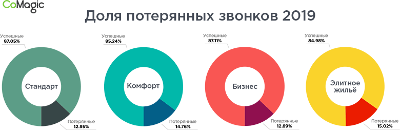 Самый высокий показатель по доле потерянных звонков наблюдался в классе «Элитное жилье». Более чем 15% потенциальных покупателей не удалось дозвониться продавцу. В «Стандарте» и «Бизнесе» почти 13% не получили ответа на звонок, в «Комфорте» — более 14%.