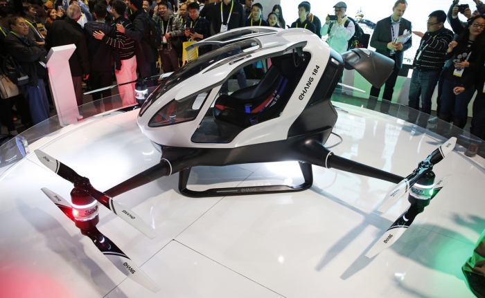 На CES 2016 сбылась мечта поклонников советского фильма «Гостья из будущего». «Флипы» — небольшие летающие авто, на которых передвигались герои, воспроизвела китайская компания Ehang. Устройство представляет собой пассажирский дрон без каких-либо возможностей им управлять для того, кто находится внутри. Пассажиру доступен только сенсорный терминал, на котором можно задать пункт назначения.