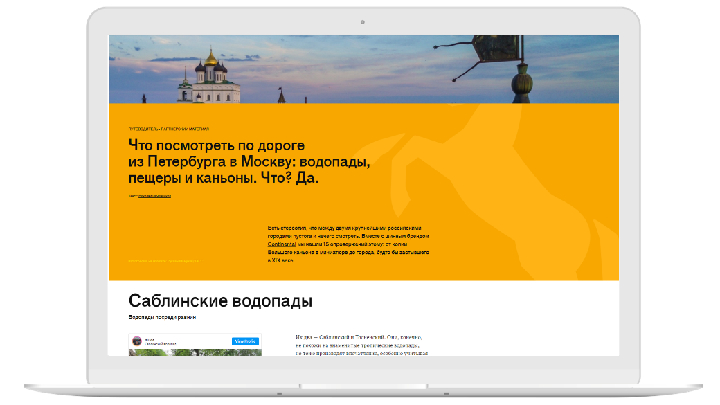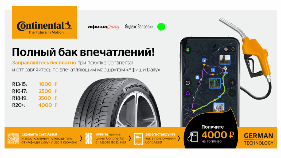 Continental — немецкий бренд шин в сегменте премиум, который так же как и конкуренты проводит стимулирующие промо в высокий сезон — весной и осенью. Бриф с задачей на разработку и реализацию сезонной акции выглядел как обычно. Но COVID-ограничения подсказали нам ключевой инсайт, который мы сформулировали так: «Засиделись дома? Тянет в путешествия? Continental подарит полный бак впечатлений! За покупку шин вы получаете не только код для обмена на топливо в современном и безопасном сервисе «Яндекс.Заправки», но и классный путеводитель и чек-лист от «Афиши», настроенный под ваши интересы и состав участников, для незабываемой поездки загород на день или два».