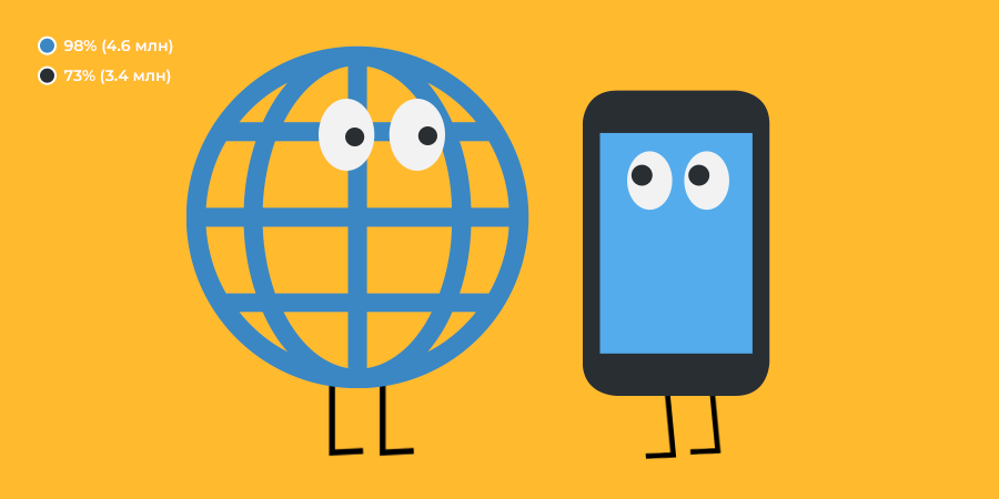 98% пользуются интернетом, у 73% есть смартфоны. Для сравнения, в среднем в России около 73% населения присутствует онлайн.