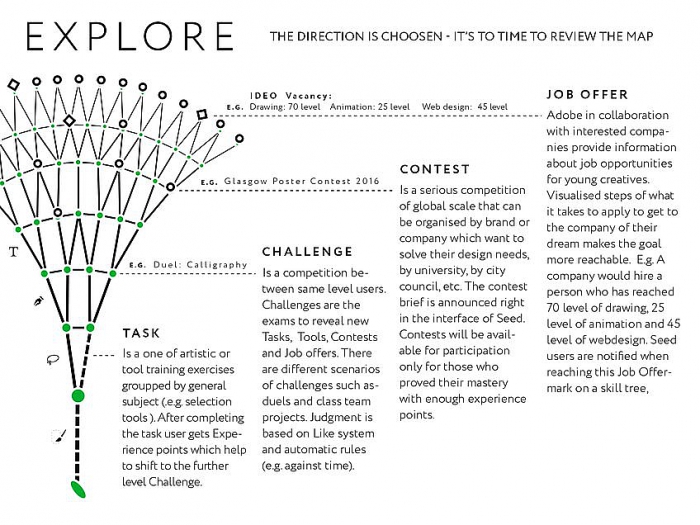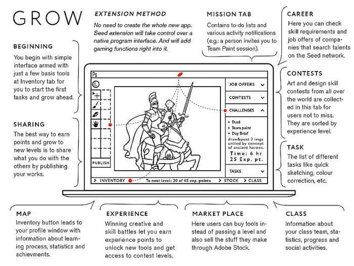 Айдентика в целом - это инструмент для выделения бренда среди остальных компаний, но иногда она отделяет бренд от самого себя. Приложения Adobe были переделаны с использованием мотивационных функций видеоигр для облегчения процесса изучения и изменения имиджа компании в сторону бренда, который способствует обучению и хорошим перспективам молодых талантов.
