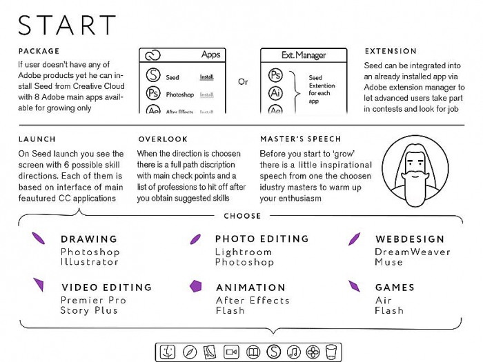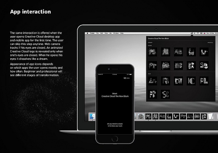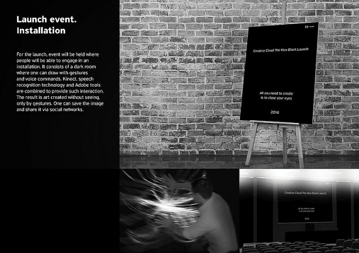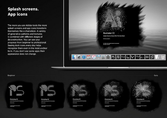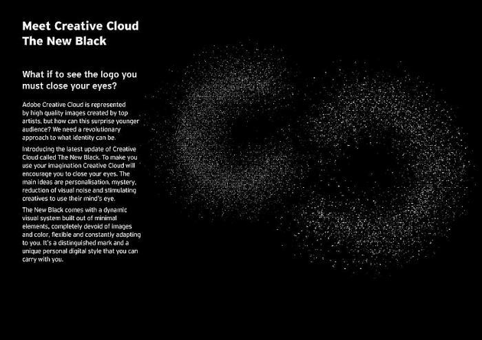 Последнее обновление Adobe Creative Cloud под названием The New Black прибывает с динамической визуальной системой, созданной из минимальных элементов, абсолютно лишенных изображений и цвета, гибкого и постоянно приспосабливающегося к пользователю. Главная цель кампании состоит в том, чтобы стимулировать креативщиков к использованию своего креативного мышления.