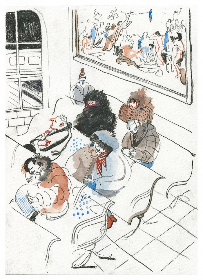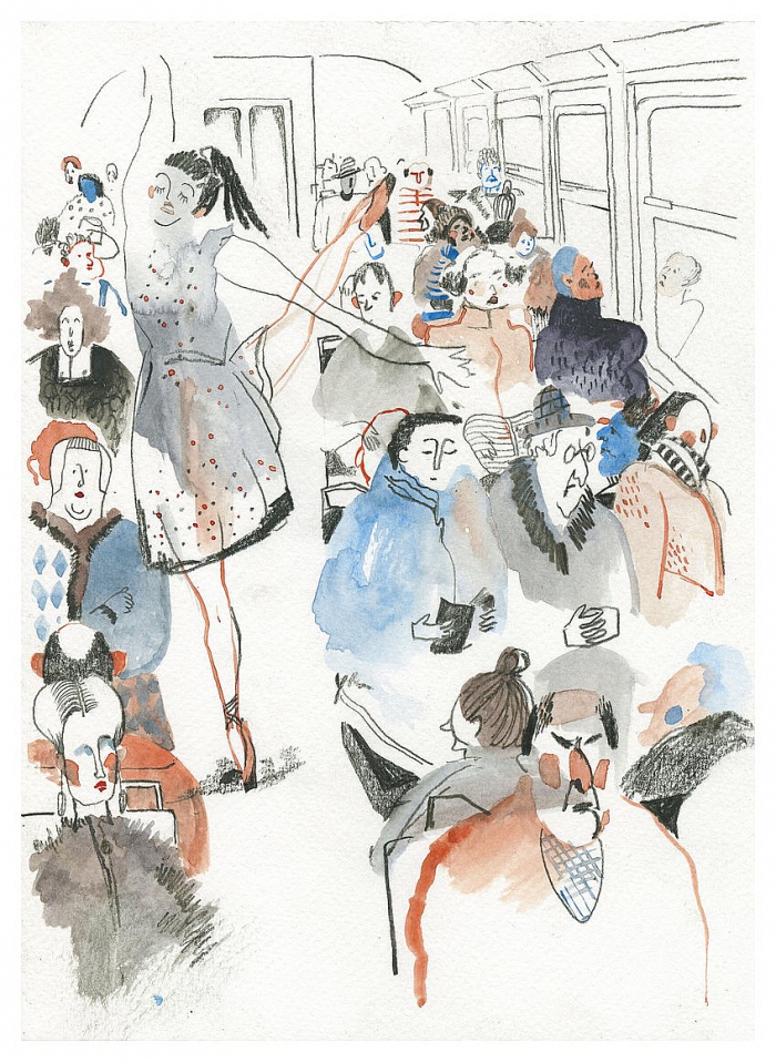 Главная тема иллюстраций - неожиданное искусство в тех местах, где оно игнорируется. Это контраст двух миров, сравнение разных реальностей. Первая иллюстрация, на которой люди спят под большой картиной "Явление Христа Народу" А. Иванова - метафора путешествия и возвращения. Вторая, на которой старая женщина играет на скрипке в метро - квеста. А третья, на которой показана танцовщица в поезде метро - перерождение.