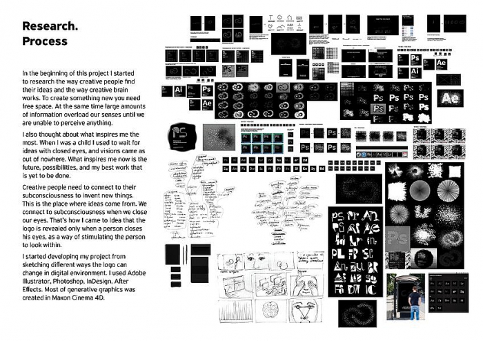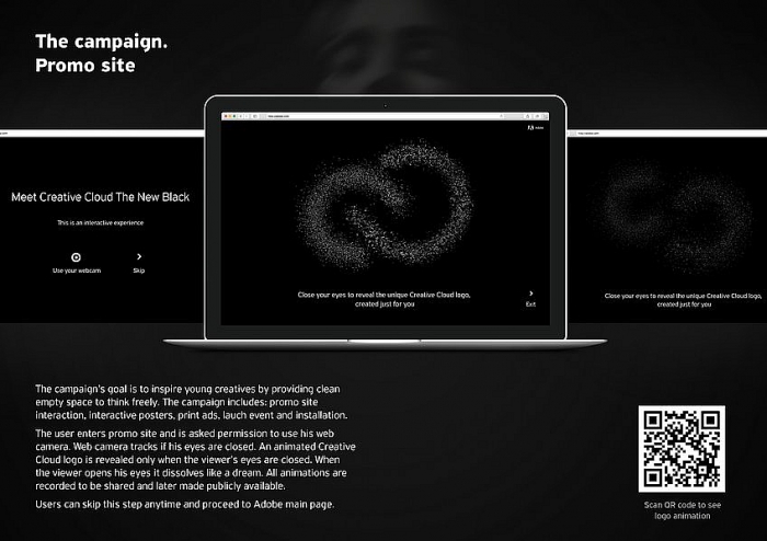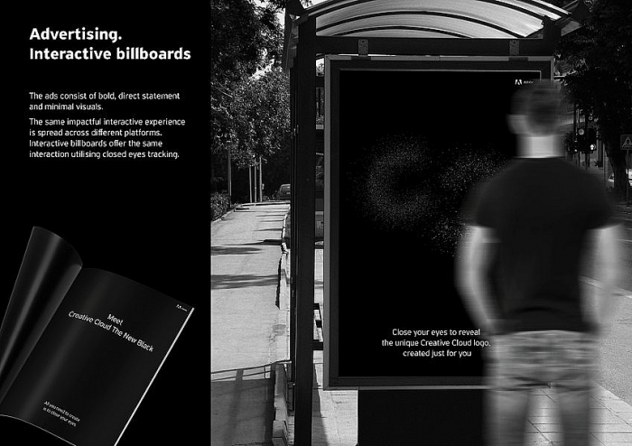 Самая высокая награда в Британке в этом году у меня на курсе интерактивщиков, это Графитовый Карандаш — серебро Саши Постниковой за проект для Adobe, в котором мы отказываем компании вообще в цвете и избавляемся от логотипа, пока пользователь не закроет глаза во время активации продукта. Радикальное решение - черный, минималистичный дизайн без идентификаторов, который своей новой природой привлечет молодое поколение.