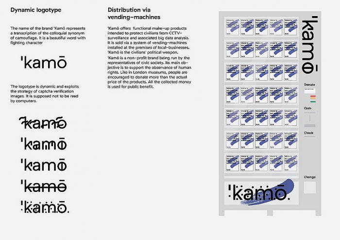 Kamo - это проект для защиты гражданских лиц от наблюдения CCTV и сопутствующего анализа данных. Он продаётся через систему торговых автоматов, установленных в помещении локальных компаний. 'Kamo - это политическое оружие гражданских. Его основная цель состоит в том, чтобы поддерживать соблюдение прав человека. Все собранные деньги используются в общественных интересах.