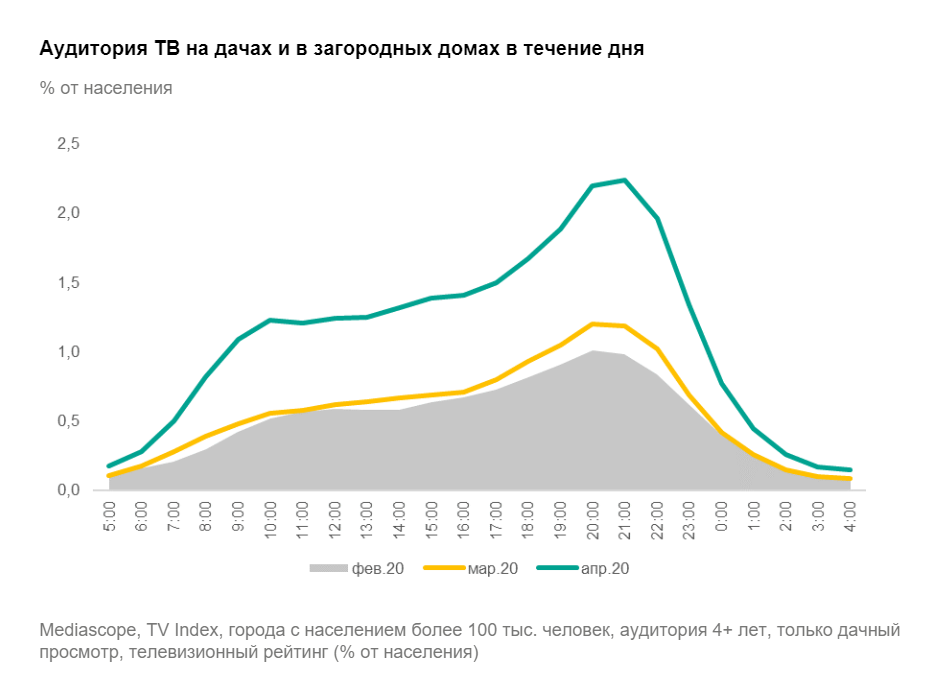 Аудитория ТВ на дачах в апреле по сравнению с мартом и февралем 2020 выросла в течение всего дня, в том числе — в прайм-тайм.
