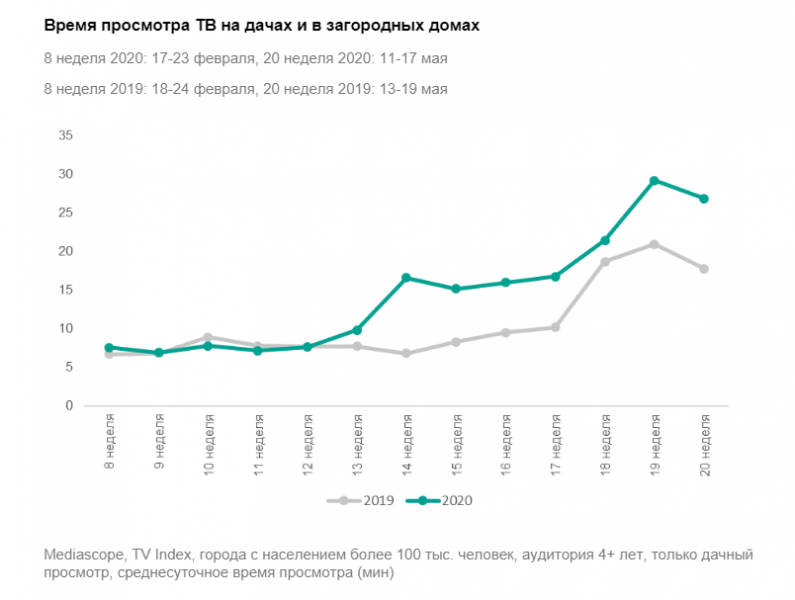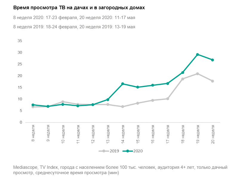 Время телепросмотра на дачах начало активно расти с 13-й недели 2020 года (23−29 марта), но сильнее всего выросло в первую неделю карантина, которая была объявлена нерабочей — с 30 марта по 5 апреля. Относительно аналогиченой недели в 2019-м время просмотра ТВ за городом выросло в полтора раза. Пиковых значений дачный телепросмотр достиг во время майских праздников — на неделе с 04 по 10 мая. В этот период россияне смотрели ТВ на дачах в среднем около 30 минут каждый день — на 40% больше, чем за аналогичную неделю 2019 года.