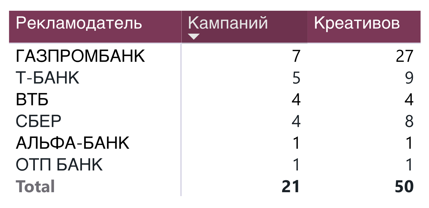Среди банков, которые запускали новые рекламные кампании в этот период, мы видим также ВТБ, «Сбер», «Альфа Банк», «ОТП Банк».