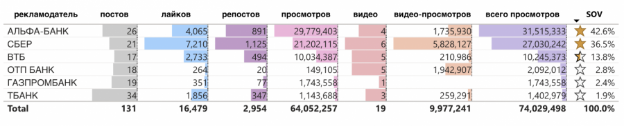 В январе 2025 года за видимость своих промопостов в соцсети «ВКонтакте» активно конкурировали «Альфа Банк» и «Сбер», достигнув SOV в 42,6% и 36,5% соответственно.
