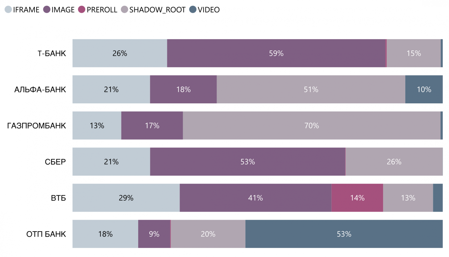 Самые популярные форматы, используемые банками в своем продвижении на просторах интернета — shadow_root и image, на которые в совокупности приходится 72% всех размещений проанализированных банков. В сплите у «Газпромбанка» доля формата shadow_root и вовсе составила 70%.