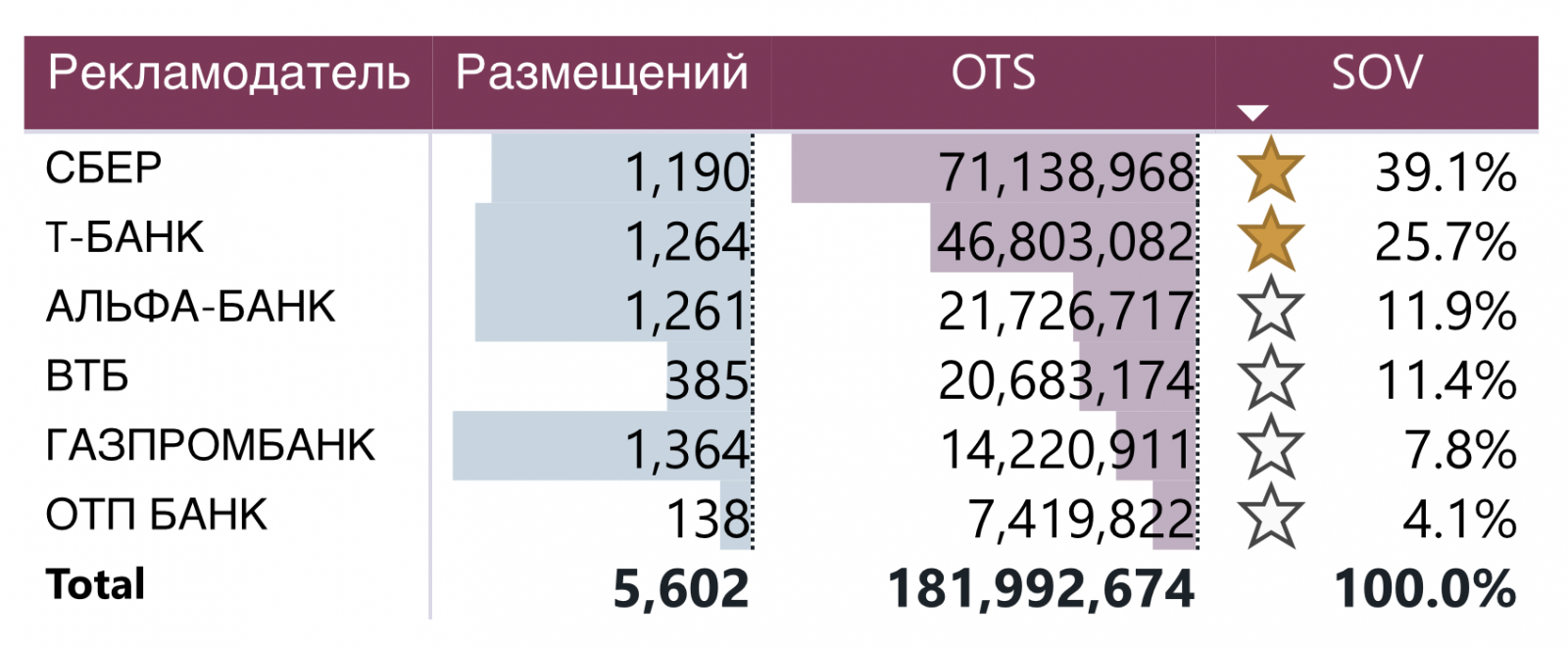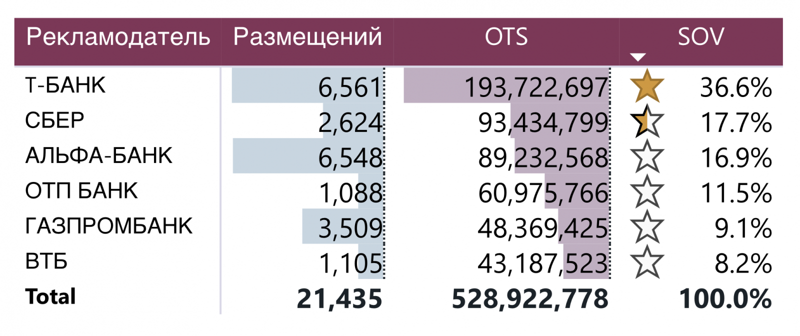 В январе 2025 года «Т-Банк» стал наиболее заметным среди шести анализируемых банков, достигнув доли видимости (SOV) в 36,6%. Показатель вырос почти на 70% по сравнению с предыдущим месяцем (декабрь 2024 года). При этом банк сделал ставку не на количество, а на качество рекламных кампаний: несмотря на сокращение числа размещений на 11%, его видимость для аудитории росла.